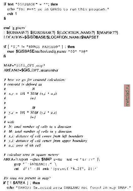 Главная --> Промиздат --> Map principle MAP=$1 r.stats -1 $MAP I awk BEGIN {sum = 0.0 ; sum2 = 0.0) NR == Ifmin = $2 ; max = $1} {sum += $1 ; sum2 += $1 * $1 ; N++) if ($1 > max) {max = $1) if ($1 < min) {min = $1} END{ print Number of raster data samples N = ,N print Minimum value MIN = ,min print Maximum value MAX = ,max print Variation v = , (max - ((min * -1) * -1)) print Mean MEAN = ,sum / N print Variance S2 = , (sum2 - sum * sum / N) / N print Standard deviation S = , sqrt ( (sum2 - sum * sum/N) / N) print Variation coeffic. V = , 100*(sqrt((sum2 - sum*sum/N)/N)) \ /(sum/N) This script must be used from inside GRASS. The name of the input raster map is specified as a parameter. Within this script the output of the GRASS module r.stats is piped to the program awk. The statistical calculations are done within awk, and the results are printed out. A modified version of the above script, r.univar, is provided with GRASS. The next script example calculates the center of gravity of an area (area centroid). You can use it to find the center of gravity of a region defined by a watershed boundary. The script requires a watershed map generated by r.watershed. Internally, all basins except the watershed of interest are masked out with r.mask. You can save the following script as a text file r.centroid: §!/bin/sh # This pmgram is Free Software under the GNU GPL (>=v2). # Calculate centroid of raster area (center of gravity) # Parser definitions: Module #% description: Calculates centroid of raster area (center of gravity) #%End #%option #% key: map #% type: string #% gisprompt: old,cell,raster #% description: raster input map #% required: yes mend #%option #% key: areanumber #% type: integer #% description: number of area for centroid calculation #% required: yes nend ![]() exit 1 # determine current resolution and LOCATION units: EWRES=awk /е-w/ { print $3) $L0CAT10N/W1ND NSRES=awk /п-s/ { print $3) $L0CATI0N/W1ND if [ -f $LOCATION/. ./PERMANENT/PROJ.UNITS ] ; then UNITS=cat $L0CATI0N/.7PERMANENT/PR0J-UNITS \ awk /units:/ {print $2} else UNITS= cellunits echo Area of basin $AREANO: SAREA meters~2 echo Current cell resol. [$UNITS]: EW: $EWRES, NS: $NSRES it set MASK to get only selected area: g.rename rast=MASK,$TMP.MASK 2> /dev/null r.mapcalc MASK= if ($MAP == $AREANO) echo Showing selected area. . . d.rast $MAP echo Calculating x min and x min of area. . . calculate x-min XMIN=r.stats -Ignq $MAP cut ~d -fl awk BEGlN{min = 0.0} NR == l{min = $1) {if ($1 < min) {min = $1}} END{print min) icalculate yjnin YMIN=r.stats -1gnq $MAP (cut -d -f2 awk BEGiN{min = 0.01 NR == Kmin = $1} {if ($1 < min) {min = $1}} END{print min} echo Calculating centroid. . . # calculate xjc: r.stats -Ignq $MAP cut -d -fl awk BEGIN{ sum = 0.0 ; calc = 0.0 ; xmin2 = 0.0 ewres = $EWRES ; nsres = $NSRES xmin = $XMIN ; area = $AREA} NR == l{xmin2 = xmin * 1.0) {calc = ($1 - xmin2) * ewres * nsres} { sum = sum + calc} END{printf Center of gravity x c: %.2f\n , sum/area + xmin2} # calculate yc: r.stats -1gnq $MAP cut -d -f2 awk BEGIN{ sum = 0.0 ; calc = 0.0 ; ymin2 = 0.0