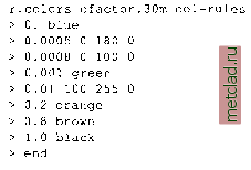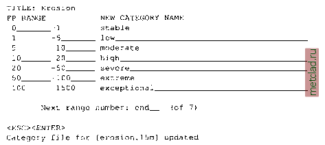 Главная --> Промиздат --> Map principle This page intentionally left blank g.region -p rast=landcover.30m d.erase d.rast landcover.30m d.rast.leg -n landcover.30m r.recode landcover.30m out=cfactor.30m > 11:23:0.:0. > 31:32:0.8:0.8 > 41:41:0.0005:0.0005 > 42:42:0.0008:0.0008 > 43:43:0.0005:0.0005 > 51:71:0.001:0.001 > 81:81:0.01:0.01 > 82:83:0.2:0.2 > 85:85:0.001:0.001 > 91:92:0. :0. > end The individual categories are described in more detail in the metadata file provided with the land cover map; therefore, more accurate values of the C factor can be assigned. To get a nice map, we define a special color table: ![]() d.rast cfactor.30m You can compare the new C factor with the one derived from the 100 m resolution vegcover data to appreciate the higher quality of the new data. 12.1.3 Computing and analyzing erosion risk Finally, we can calculate the erosion risk for the given vegetation cover using r.mapcalc. In the map layers soils.Kfactor, cfactor.lQQm, we use the representation of K factor and C factor as category labels and we have to put at (@) in front of the map name so that r.mapcalc uses the category labels instead of category numbers: g.region -p rast=lsfactor.15m r.mapcalc erosion.15m=65. * @soils.Kfactor\ * lsfactor.l5m * @cfactor.100m The resulting map layer represents soil erosion rate at the center of each grid cell in ton/(acre.year). Note that GRASS has automatically resampled the rasters representing the soils and the C factor from their original resolutions (20 m and 100 m) to 15 m resolution. Because these two map layers represent discrete homogeneous areas, identified by their integer category numbers (and not continuous fields), such resampling is appropriate. Similarly as for the LS factor, it is useful to define a special color table and categories for the resulting map, while keeping in mind the skewed distribution of erosion rates, with most areas within the low rates range and very few areas in a large interval of high values: ![]() Now type 7 over 0 followed by <ESC><ENTER>, and you will see the category table with floating point ranges all set to zero. Overwrite the zeros with your selected values and add the category labels: The fp data in map erosion.15m ranges from 0.00 to 699.056291 [erosion.15m] ENTER NEW CATEGORY NAMES FOR THESE CATEGORIES 65.*@soils.Kfactor*Isfactor.15m*@cfactor.100m ![]()