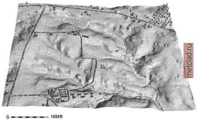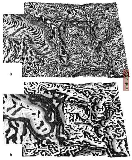 Главная --> Промиздат --> Map principle ![]() Figure 12.3. Interpolating DEM from contours: profile curvature displayed with input contours a) tension is too high and the pattern of curvature follows contours, b) with lower tension the pattern disappears For some applications it is useful to create a DEM with buildings. We can compute it using the building footprints which are available as vector data. First, we need to transform them to raster and then we add their average height, in our case 20 ft, to the DEM: v.to.rast lw buildings out=buildings d.rast el.etlO d.rast -o buildings r.null buildings null=0 r.mapcalc elevbldg.6=if(buildings > 0, el.6tl0+20, el.6tl0) r.mapcalc elevbldgco.6=if(buildings > 0, -1, el.6tl0) r.colors elevbldgco.6 rast=el.6tl0 nviz elevbldg.6 col=elevbldgco.6 vector=lw roads,lw hydro Note that we had to convert NULLs in the buildings map to zeroes first because NULLs override any other value when used in r.mapcalc expressions (see Section 5.2). We have also created an additional raster to be used for color and displayed it together with roads and streams in 3D using nviz (Figure 12.4). The surface has the typical elevation color scheme with buildings displayed in white with grey shades. You can adjust the z-exaggeration and light to enhance the 3D perception and save your view as a PPM, TIFF or RGB image (see Chapter 8). Topographic analysis. Topography has a profound influence on fluxes in landscapes and is often a major factor in decisions related to land use. Therefore map layers representing watershed boundaries and topographic parameters (see Section 5.4) are used as the basis for selection of land management units, ![]() Figure 12.4. High resolution DEM interpolated from 2 ft contours with buildings viewed in nviz. Our practice area is in the west section placement of monitoring equipment, evaluation of suitability of the current land use for existing topographic conditions and a number of other issues. Local (point) topographic parameters. A number of parameters describing the geometry of the terrain surface are needed as inputs for land use suitability analysis and modeling of various processes. These parameters represent measures of change in elevation (gradient) and measures of rate of this change (curvatures) and are usually expressed as the following parameters (see also Section 5.4.5 and the exact mathematical definitions and equations in the Appendix B.3): slope (steepest slope angle, magnitude of gradient); aspect (slope orientation, direction of gradient, steepest slope direction, direction of flow); profile curvature (curvature in the direction of the steepest slope - perpendicular to contour lines, convex curvature leads to accelerated and concave to decelerated flow); tangential curvature (curvature in the direction of contour tangent - perpendicular to the steepest slope direction, convex curvature leads to dispersal and concave to convergent flow). It is possible to define a number of additional parameters (see, for example the module r.param.scale), however, for most applications only slope and aspect is needed. We have already computed these parameters simultaneously with interpolation using v.surf.rst, and we have used the profile curvature to look for artificial patterns in the DEM (Figure 12.3). We have also used r.slope.aspect to derive slope and aspect from the USGS NED data to evaluate potential problems in this DEM (see the relevant paragraph above). Because the landscape processes have multiscale character and different processes are dominant at different scales, it is sometimes useful to extract topographic features and patterns at different levels of detail. In s.surf.rst or v.surf.rst, this can be achieved by changing tension and smoothing (lower tension and higher smoothing produces smoother topography with curvatures representing main features, higher tension captures more detail and smaller features, see Section 7.3 as well as the Figure 12.3). We can also use r.param.scale, which has additional options to extract the main topographic features, peaks, ridges, passes, channels, pits and planes and compute a number of additional parameters. Learn more about topographic analysis in the book by Wilson and Gallant, 2000, and publications by Wood, 1996, Mitasova and Hofierka, 1993, and Moore and Burch, 1986.