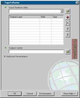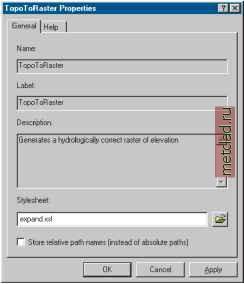 Главная --> Промиздат --> Построение моделей технологопроцесса <?xml version= 1.0 ?> <xsl:stylesheet xmlns:xsl= http: www.w3.org/1999/XSL/Transform version= 1.0 > <xsl:import href = MdDlgContent.xsl /> <xsl:output method= html /> <!-- Overwrite Select Templates <xsl:template match= PropertyGroup > <TR valign= top ><TD> <DIV ID= GEN STYLE= cursor: hand; > <!-- Process required parameters -- > <xsl:for-each select= Property > <xsl:choose> <xsl:when test=not(contains(PropertyLabel, (optional) ))> <xsl:apply-templates select= . /> </xsl:when> </xsl:choose> </xsl:for-each> <!-- Add expanding section for optional parameters <TABLE onclick= parent.clicker({PropertyGroupName},{PropertyGroupName}Image); STYLE= cursor:hand; border= 0 cellspacing= 0 cellpadding= 0 width= 94% > <TR valign= top bgcolor= menu > <TD colspan= 2 > <TABLE border= 0 width= 100% cellpadding= 0 cellspacing= 0 > <TR bgcolor= menu > <TH align= left > <IMG ID= {PropertyGroupName}Image SRC= {../../CommonPath}/ triangle.gif ALT= * ALIGN= MIDDLE BORDER= 0 WIDTH= 11 HEIGHT= 11 /> <SPAN class= caption STYLE= color:menutext; >Optional Parameters</ SPAN> </TH> </TR> </TABLE> </TD> </TR> <TR valign= top > <TD colspan= 2 > <DIV ID= {PropertyGroupName} STYLE= display:none; onclick= window.event.cancelBubble = true; > <TABLE border= 0 cellspacing= 1 cellpadding= 4 width= 90% > <xsl:for-each select= Property > <xsl:choose> <xsl:when test=contains(PropertyLabel, (optional) )> <xsl:apply-templates select= . /> </xsl:when> </xsl:choose> </xsl:for-each> </TABLE> </DIV> </TD> </TR> </TABLE> </DIV> </TD></TR> </xsl:template> </xsl:stylesheet> В этом примере шаблон стиля expand.xsl задается в текстовом окне Список стилей в закладке Общие диалогового окна свойств инструмента. Поскольку не определен путь доступа, этот файл должен быть сохранен в папке \ArcGIS\ArcToolbox\Stylesheets. ![]() Открыв диалоговое окно инструмента, вы увидите примененный шаблон стиля. Обратите внимание, что дополнительные параметры собраны в расширяемом разделе Дополнительные параметры. ![]() Нажатие на стрелку вниз слева от строки Дополнительные параметры позволит развернуть этот раздел и ввести значения для дополнительных параметров.