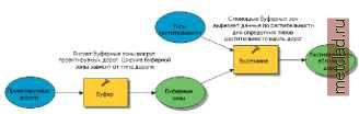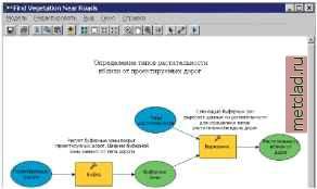 Главная --> Промиздат --> Построение моделей технологопроцесса В окне ModelBuilder откроется заранее построенная модель, которую вы можете просмотреть. ![]() Элементы входных данных, которые представляют существующие данные, на модели показаны голубыми овалами. Элементы инструментов, представляющие инструменты, хранящиеся на диске, отображаются в виде желтых прямоугольников. Элементы производных данных, соответствующие данным, которые будут получены при выполнении программы, на схеме показаны зелеными овалами. 5. Выберите закладку Поиск в окне ArcToolbox. 6. Напечатайте Буфер ( Buffer ), затем нажмите Поиск, чтобы найти инструмент Буфер в окне ArcToolbox. ![]() Если в окно ArcToolbox добавлены наборы инструментов Analysis Tools (Инструменты анализа) и Coverage Tools (Инструменты покрытий), в списке найденных инструментов вы увидите два инструмента Буфер. Инструмент Буфер в наборе Инструментов покрытий работает только с покрытиями. Инструмент в наборе Инструментов анализа использует в качестве входных данных классы пространственных объектов. 7. Выберите инструмент Буфер из набора Инструменты Анализа и нажмите Определить местоположение. ![]() Инструмент размещен в окне ArcToolbox. ![]() Вместо того, чтобы открыть диалоговое окно инструмента Буфер из окна ArcToolbox, вы сделаете это в окне ModelBuilder. В этом окне вы просмотрите значения параметров, заданные для данного инструмента. 8. Щёлкните правой кнопкой мыши на элементе Инструмент Буфер (Buffer) в модели и выберите опцию Открыть, чтобы открыть диалоговое окно инструмента. ![]() Описание инструмента по умолчанию отобразится на панели Справка. 9. Щелкните поочередно на каждом параметре в диалоговом окне, чтобы просмотреть справку по каждому из параметров. 10.Нажмите Справка, чтобы при желании получить более подробную справку по инструменту. 11.Нажмите Отмена в диалоговом окне Буфер. ![]() 12. Щёлкните правой кнопкой мыши на элементе инструмента Вырезание (Clip) и выберите опцию Открыть, чтобы открыть его диалоговое окно. 13. Изучите значения параметров, аналогично тому, как вы проделали это для инструмента Буфер, а затем нажмите Отмена. В этой модели присутствуют два процесса, каждый из которых состоит из инструмента и значений его параметров, -один использует инструмент Буфер, а второй - инструмент Вырезание. Два процесса соединены вместе для построения модели. Запуск модели Модель раскрашена, это означает, что программа готова к выполнению, так как все необходимые значения параметров были введены в диалоговом окне каждого из инструментов. 1. В меню Модель выберите опцию Запустить. Find Vegetation Near Roads Модель Редактировать Окно Справка После того как модель запущена, инструмент, задействованный в процессе и исполняемый в данный момент, выделяется красным цветом. По мере выполнения процесса позади инструмента и элемента производных данных появляется падающая тень, которая указывает на то, что процесс выполнен и производные данные сохранены на диске. 2. Нажмите Закрыть в диалоговом окне выполнения процесса. ![]() Окончательный результат добавляется в ArcMap по умолчанию, поскольку опция, определяющая то, что выходные данные добавляются к изображению, отмечена в контекстном меню элемента производных данных Растительность вблизи дорог (Vegetation Near Roads). 3. Нажмите правую клавишу мыши на элементе производных данных Растительность вблизи дорог (Vegetation Near Roads) в 