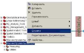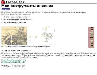 Главная --> Промиздат --> Построение моделей технологопроцесса Просмотр документации для наборов инструментов Вы можете просматривать документацию для всех системных наборов инструментов и для пользовательских наборов инструментов, для которых вы добавляли документацию. Вся документация, добавляемая в раздел Справка Редактора документации, будет отображаться, когда доступ к Справке для набора инструментов будет осуществляться из окна ArcToolbox. ► Просмотр Справки для набора инструментов в окне ArcToolbox 1. Нажмите правую кнопку мыши на наборе инструментов и выберите Справка. Откроется документ HTML, отображающий документацию для набора инструментов. 2. Нажмите Закрыть, чтобы закрыть окно Справки. ![]() ![]() Метаданные для набора инструментов можно просмотреть в закладке Метаданные набора инструментов из дерева ArcCatalog. Отображается только информация, добавляемая в раздел Редактора документации Общая информация , а также список групп инструментов, если были созданы какие-либо группы. См. также Обратитесь к разделу в этой главе Добавление документации к наборам инструментов за информацией о создании документации для своих наборов и групп инструментов. Просмотр метаданных для набора инструментов 1. Выберите набор инструментов в дереве ArcCatalog, затем откройте закладку Метаданные. В закладке Метаданные может отображаться краткое описание, ключевые слова, информация об ограничениях и список групп инструментов, в зависимости от того, что задокументировано в Редакторе документации. ![]() Правила работы с наборами инструментов Если набор инструментов будет изменен в одном приложении, например, в ArcMap, в то время как другое приложение, например ArcCatalog, имеет к нему доступ, существует вероятность того, что изменения будут потерян!. Когда закрывается последнее приложение, оно просто перезапишет любые изменения, внесенные ранее. При внесении изменений в набор инструментов, следите за тем, чтобы было открыто одно приложение, чтобы избежать конфликтов такого рода. Ошибки не будут возникать, когда доступ к набору инструментов имеет несколько приложений, но результирующий набор инструментов может быть не совсем таким, как вы ожидали. Правила доступа к набору инструментов: Набор инструментов перезаписывается, когда изменение внесено. Обновите набор инструментов в других приложениях, обращающихся к тому же набору инструментов, чтобы обновить содержание набора инструментов. Если несколько приложений обращаются к набору инструментов, содержание набора инструментов определяется последним закрываемым приложением. Изменения, внесенные в набор инструментов в приложениях, закрытых ранее, будут потеряны. Если два приложения обращаются к набору инструментов одновременно, изменения, внесенные в одном приложении, не будут восприниматься набором инструментов в другом приложении. Например, если набор инструментов открпт в ArcCatalog и в ArcMap, и в ArcCatalog добавлен новый инструмент, ArcMap не увидит инструмент до тех пор, пока не откроет набор инструментов заново. Удаление набора инструментов из окна ArcToolbox в ArcMap, с последующим добавлением его обратно, обновит содержание набора инструментов. Если доступ к набору инструментов осуществляется одновременно из двух приложений, удаление набора инструментов в одном приложении не приведет к тому, что оно будет удалено в