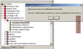 ![]() Второй способ поиска инструментов - использование индекса ArcToolbox. Если вы знаете название инструмента, который ищите, это самый быстрый способ определения его местоположения. Третий способ, с помощью которого можно искать инструменты, - использование закладки ArcToolbox Поиск. Он особенно полезен, если вы не уверены в названии искомого инструмента, но знаете тип данных, которые вы хотите использовать как входные. В следующем примере, ввод текста Coverage (Покрытие) приводит к поиску всех инструментов, для которых слово Покрытие задано как ключевое в документации инструмента. Этот метод поиска инструментов полезен также для определения местоположения инструментов, название которых отличается от того, к которому вы привыкли. Ключевые слова связывают старые названия системных инструментов с их новыми именами, следовательно, если вы набираете название переименованного инструмента, вы сможете определить местоположение инструмента, который вы хотите использовать. Например, набрав GreaterThan (БольшеЧем), вы сможете найти инструмент GreaterThanFrequency дополнительного модуля к ArcGIS Spatial Analyst. Использование индекса ArcToolbox для поиска инструментов 1. Откройте закладку Индекс в нижней части окна ArcToolbox. 2. Если известно название инструмента, который вы хотите использовать, наберите его название, или прокрутите список, чтобы найти искомый инструмент. 3. Выберите инструмент, затем либо дважды: щелкните на инструменте, чтобы открыть его диалоговое окно, либо нажмите Определить местоположение, чтобы переключиться на список Избранн1х наборов инструментов, и просмотрите место хранения инструмента в наборе. ![]() Поиск инструментов в ArcToolbox 1. Откройте закладку Поиск в окне ArcToolbox. 2. Наберите слово для поиска инструментов. 3. Нажмите Поиск. Отобразится список всех инструментов, содержащих это слово. 4. Выберите инструмент, затем либо дважды щелкните на инструменте, чтобы открыть его диалоговое окно, либо нажмите Определить место, чтобы переключиться на список Избранных наборов инструментов, и просмотрите место хранения инструмента в его наборе. ![]() Что такое лицензирование инструмента Совокупность доступнхх для использования системнхх инструментов зависит от того, какую лицензию ArcGIS (ArcView, ArcEditor, или ArcInfo) вы используете. Дополнительные модули (например, ArcGIS Spatial Analyst) позволяют вам получить доступ к дополнительным инструментам. По умолчанию, в дереве ArcCatalog вы будете видеть все инструменты, независимо от того, есть ли у вас лицензия на использование конкретного инструмента. Если у вас нет лицензии на использование инструмента, поверх него будет появляться иконка блокировки. В окне ArcToolbox вы не увидите инструменты, лицензии на использование которхх у вас нет по умолчанию. Если вы хотите просмотреть эти инструменты, нажмите правую клавишу мхши в окне ArcToolbox и снимите отметку с опции Скрыть заблокированные инструменты. Инструменты, на использование кото-р1х у вас нет лицензии, появятся с иконкой блокировки поверх названия. ![]() Иконка блокировки будет появляться поверх нелицензированных инструментов. Чтобы иметь возможность запустить инструмент, у вас должна быть соответствующая лицензия. Для просмотра документации по инструментам, лицензия на использование которых есть в том или ином программном продукте ArcGIS, наберите Quick Reference Guide ( Справочное руководство ) в закл