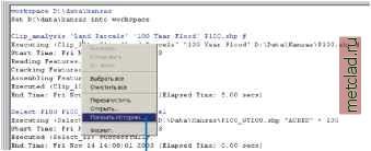 Главная --> Промиздат --> Построение моделей технологопроцесса введенный текст, не являющийся частью команды, необходимо будет удалить, когда вы загрузите текст обратно в окно командной строки, но файл, содержащий относящуюся к инструменту информацию, может оказаться полезным, наряду с запускаемыми вами командами. Любой текстовой файл (.txt) может быть загружен в командной строке. Вероятно, вы будете только загружать текстовые файлы, созданные вами при сохранении команд, введенных в командную строку. Любой другой текст, сохраненный в текстовом файле и не являющийся частью команды, должен быть удален до выполнения команд. После выполнения инструмента его копия по умолчанию помещается в историю, следовательно, вы можете сохранять запись о всех инструментах, использованных в каждом сеансе работы. Дополнительную информацию об истории модели вы найдете в следующем упражнении и в разделе Отслеживание операций геообработки в Главе 3. Загрузка текстового файла 1. Нажмите правую кнопку мыши в командной строке и выберите опцию Загрузить. 2. Щелкните на стрелке вниз для опции Искать в: и перейдите к месту на диске, где хранится текстовой файл, содержащий запускаемые вами команды. 3. Выберите текстовой файл и нажмите Открыть. Текст вводится в командную строку. вИмтть Выбрать все Сохранить мк.. Вставить переменную,. Переменные... ![]() См. также Обратитесь к разделу Сохранение команд в текстовой файл в этой главе за информацией по сохранению команд, введенных вами в командной строке, в текстовой файл. ![]() Когда вы открываете выполненный инструмент, копия запущенного инструмента будет заимствована из модели истории и отобразится в диалоговом окне, следовательно, вы сможете отредактировать значения параметров инструмента, а затем запустить его повторно. Если опция, позволяющая регистрировать операции геообработки в историю, не отмечена в закладке Геообработка диалогового окна Опции (доступ к которому можно получить из меню Инструменты Главного меню приложения, с которым вы работаете), вы не сможете повторно запустить ваши инструменты. После запуска инструментов в сеансе работы и окончания этого сеанса, в наборе инструментов История в папке Мои наборы инструментов создается модель истории. Она содержит элементы инструментов, представляющие инструменты, исполь- Подсказка Иконки быстрого доступа для повторного обращения к ранее введенным командам Дваждг щелкните мышью на ранее введенной команде в разделе сообщений окна Командная строка, чтобы ввести команду в командной строке. В командной строке используйте стрелки Вверх и Вниз на клавиатуре, чтобы прокрутить введенные ранее команды. повторный запуск инструмента 1. Если вы еще не запускали инструмент, повторите шаги 1-4 упражнения Запуск инструмента в командной строке в этой главе. Или же, запустите инструмент, воспользовавшись его диалоговым окном, или запустите его из окна ModelBuilder или скрипта. 2. В разделе сообщений командной строки, нажмите правую кнопку мыши на запускавшемся инструменте и выберите Открыть. Откроется диалоговое окно, позволяющее вам изменить значения, установленные для параметров. 3. Измените значения параметров, если это необходимо, затем нажмите OK, чтобы повторно запустить инструмент. Clip arLalysis Parcels EOUHUAET D:\data\karLSas\parcel 01 100.shp Executing (Clip 3): Clip Parcels EOUHUAPT I: Mat- ..... Start Time: Thu Nov 13 1S:S