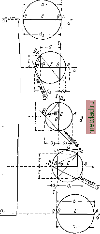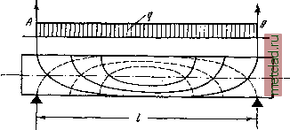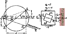 Главная --> Промиздат --> Коэффициент поперечной деформации § 95] НАПРАВЛЕНИЯ ГЛАВНЫХ НАПРЯЖЕНИЙ случае и по сечению, перпендикулярному к оси балки, будут положительны: Jb(z) Строим круг; взаимное расположение линий действия напряжений а и наибольшего (алгебраически) главного напряжения cj совпадает с относительным расположением на чертеже круга напряжений линии BD и оси абсцисс, составляющих между собой угол а (фиг. 232). ![]() Фиг. 232. Чтобы на чертеже элемента построить линию действия а надо от направления отложить угол а по часовой стрелке. При перемещении выбранного элемента в пределах сечения направление главных напряжений меняется. У краёв балки одно из главных напряжений нуль, а другое направлено параллельно оси балки, у нейтрального слоя главные напряжения составляют углы 45 с осью балки. На фиг. 233 изображены круги напряжений и направления главных напряжений в различных точках сечения. Направление сжимающих напряжений показано на фасаде балки жирными линиями, растягивающих- тонкими. Принято, что изгибающий момент и поперечная сила в сечении положительны. Получив направление главных напряжений в какой-либо точке проведённого сечения, продолжаем направление одного из них до пересечения с соседним сечением. В полученной точке определяем новое направление рассматриваемого главного напряжения и продолжаем его до пересечения со следующим сечением. Поступая таким образом, получим ломаную линию, которая в пределе обратится в кривую, касательная к которой совпадает с направлением рассматриваемого главного напряжения в точке касания. Эта кривая называется траекторией главного напряжения. Направление траекторий главных напряжений зависит от вида нагрузки и от условий м->о Q>0 I б, ![]() Фиг. 233. § 95] НАПРАВЛЕНИЯ ГЛАВНЫХ НАПРЯЖЕНИЙ опирания балки. Через каждую точку балки можно провести две траектории главных напряжений - растягивающих и сжимающих (фиг. 234). Для сжимающих напряжений траектории показаны пунктиром, для растягивающих - сплошной линией. ![]() Фиг. 234. В железобетонных балках надо располагать арматуру так, чтобы она шла примерно в направлении траекторий главных растягивающих напряжений. Для примера на фиг. 235 показано расположение арматуры в простой балке. уЧЧЧ /> Фиг. 235. Пример 68. Балка прямоугольного сечения высотой Л= 160 мя и шириной = 80 жлг, пролётом /=0,80 ж нагружена силой Р=2 г посредине пролёта. Найти величину и направление главных напряжений в точке на расстоянии 5Г = 2 слс вверх от нейтрального слоя в сечении на расстоянии дго = 0,3 я от левой опоры. Реакции балки Л и равны 1000 кг\ изгибающий момент во взятом сечении равен М=/4л:о = 1000 . 30 = 30 000 лггслс. Поперечная сила Q=1000 кг. Момент инерции сечения У=1 = 2730 ел1 Статический момент части сечения выше уровня z равен (фиг. 236, а) = 8 . 6 . 5 = 240 ся. Нормальное напряжение в рассматриваемой точке равно 30 000 -2 = - 22 кг1ся. J ~ 2730 Касательное напряжение равно (?S(;?) 1000 . 240 t--7-+ 2730 . 8--Z - |