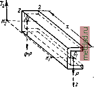 Главная --> Промиздат --> Коэффициент поперечной деформации ,§.96] ЦЕНТР ИЗГИБА суммируя все такие силы, получаем: Эти усилия показаны на фиг. 244. Кроме касательных напряжений х, по сечению действуют вертикально направленные касательные напряжения: Jb(z) Условная эпюра распределения этих напряжений показана на фиг. 245. Соответствующие усилия сложатся в равнодействующее усилие Га, которое с достаточной степенью точности можно считать равным поперечной силе Q и приложенным в центре тяжести стенка d (фиг. 244); таким образом, здесь пренебрегают вертикальными касательными напряжениями в полках (по сравнению с касательными напряжениями в стенке) ). L2 . ![]() Фиг. 244. Фиг. 245. Полная система касательных усилий, состоящая из усилия Г, и пары усилий Tiy может быть заменена одним усижем Гг, приложенным з точке /Ci, в расстоянии е от центра тяжести стенки Са. Плечо пары усилий Ti измеряется расстоянием Л (фиг. 243 и 244). Для определения расстояния е приравняем нулю сумму моментов трёх сил относительно точки Kii отсюда Qh4\t h4\t 47 (15.19) Таким образом, при изгибе швеллера сосредоточенной силой Р, приложенной в центре тяжести сечения, помимо обычных напряжений т, возникают ещё касательные напряжения т,. Суммирование всех этих напряжений даёт нам касательное усилие, проходящее уже не через центр тяжести сечения О, а через точку /Сг, так называемый центр изгиба (иногда именуемый центром жёсткости или центром скалывания). *) Все выводы этого параграфа можно считать достаточно точными, если толщины стенки и полки составляют менее 1:20 соответствующего вт<го размера. В противном случае расчёт нуждается в уточнении: при определении, например, положения усилия Т% следует учесть и вертикальные касательные усилия в полках. Если МЫ расположим силу Р в плоскости лгО-г, то отрезок балки длиной X (фиг. 246) не мом:ет быть в равновесии; поперечная сила Q в сечении 2 проходит через точку Оа, тогда как полное касательное усилие - через точку /Са- Для равновесия необходимо, чтобы в проведённом сечении возникли ещё касательные напряжения кручения, которые дадут пару, уравновешивающую совместно с усилием Га поперечную силу Q в сечении 2. Если же мы хотим избежать кручения нашей балки, то надо силу р приложить в точке Ki хотя бы при помощи приваренного отрезка уголка, как схематически показано на фиг. 247. Тогда поперечная сила в сечении 2 пройдёт тоже через точку /Сг, и равновесие по отношению к касательным напряжениям будет обеспечено. ![]() ![]() Фиг. 246. Фиг. 247. Формулу для вычисления е можно преобразовать. Подставим в неё приближённое значение момента инерции J; последний будем вычислять, принимая момент инерции полки равным её площади, умноженной на квадрат половины расстояния Л. Тогда (фиг. 243) где - толщина стенки. Называя площадь стенки tJiF, а площадь полки bit = Fn, получаем: и, далее, =4**4+f ft) hb\t 47 (15.20) Эта формула показывает, что расстояние е будет тем больше, чем больше площадь пояса по отношению к площади стенки; но во всяком случае речной силы. Впрочем, для тонкостенных стержней несимметричного профиля (см. главу XXX) скручивание балки может возникнуть и при отсутствии поперечных сил. Практическое значение рассмотренного явления достаточно велико. Балки корытного, уголкового и тому подобных I э сечений скручиваются весьма легко; поэтому расположение - плоскости действия внешних сил вне центров изгиба может п