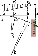Главная --> Промиздат --> Коэффициент поперечной деформации ОТДЕЛ VI. ДЕФОРМАЦИИ БАЛОК ПРИ ИЗГИБЕ. ГЛАВА XVIIf. АНАЛИТИЧЕСКИЙ СПОСОБ ОПРЕДЕЛЕНИЯ ПЕРЕМЕЩЕНИЙ. § 108. Прогиб и поворот сечения балки. При действии внешних сил, расположенных в одной из главных> плоскостей инерции балки, наблюдается искривление её оси в той же плоскости, происходит так называемый плоский изгиб. На фиг. 278 изображена в искажённом масштабе искривлённая ось балки, защемлённой одним концом и нагружённой на другом конце сосредоточенной силой. Центр тяжести О какого-либо сечения с абсциссой X перемещается в точку Oi- Перемещение OOi центра тяжести сечения по направлению, перпендикулярному к оси балки, называется прогибом балки в этом ![]() Фиг. 278. Фиг. 279. сечении или прогибом этого сечения балки. Прогиб будем обозначать буквой у. Строго говоря, так как ось балки, лежащая в нейтральном слое, не меняет при изгибе своей длины, то точка Oi сместится несколько в сторону от перпендикуляра к оси балки. Однако обычно прогибы у малы по сравнению с длиной балки, и указанное смещение в сторону является величиной уже 2-го порядка малости по отношению к длине балки, - им поэтому пренебрегают. При деформации балки сечение, оставаясь плоским, поворачивается по отношению к своему прежнему положению. На фиг. 279 изображено сечение 7 до и после деформации. Угол 0, на который каждое сечение поворачивается по отношению к своему первоначальному положению, называется углом поворота сечения. Для практических целей необходимо уметь вычислять прогибы и повороты для любого сечения балки. Величина наибольшего прогиба может служить мерилом того, насколько искажается форма конструкции при действии внешних сил. Обычно с целью сохранения соединений частей балки от расшатывания и уменьшения колебаний под действием подвижной нагрузки ограничивают величину наибольшего прогиба балки под нагрузкой. Так, для стальных балок в зависимости от назначения их ставят условием, чтобы прогиб не превосходил -уо 250 пролета. Кроме того, знание деформаций балки нам потребуется при решении статически неопределимых задач, когда число опорных реакций превышает число уравнений статики. Дополнительные уравнения могут быть написаны лишь путём изучения деформаций конструкции. Для того чтобы полностью знать деформацию балки, необходимо уметь вычислить для каждого сечения его прогиб у и угол поворота б. Оба они будут функциями от х - расстояния сечения от начала координат; между у и В для каждого сечения имеется определённая зависимость. Выберем систему координат, которой будем в дальнейшем пользоваться. Начало координат расположим в одной из точек первоначальной оси балки, которую всегда будем выбирать за ось х\ ось у будем направлять перпендикулярно первоначальной оси балки вверх. При таких условиях уравнение у=/\х) (18.1) представит собой уравнение кривой, по которой изогнётся ось балки под нагрузкой; это будет уравнение изогнутой оси балки. Касательная к изогнутой оси балки (фиг. 279) в точке Oi составит с осью X угол; равный б, т. е. углу поворота поперечного сечения относительно первоначального положения. С другой стороны, тангенс угла, образованного касательной к кривой >=/(дг) с осью х, как известно, равен tg6 = -g.. (18.2) Так как на практике прогибы балки обычно малы по сравнению с пролётом, то б бывают очень малыми углами, обычн