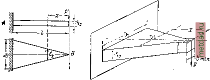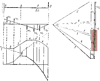 Главная --> Промиздат --> Коэффициент поперечной деформации § 120] ГРАФИЧЕСКИЙ МЕТОД ПОСТРОЕНИЯ ИЗОГНУТОЙ оси ВАЛКИ 387 Фиктивная балка тоже будет шарнирно-опёртой на две опоры; деля площадь фиктивной нагрузки на несколько частей, строим верёвочный многоугольник и проводим замыкающий луч О. Ординаты верёвочного многоугольника, измеренные от замыкающей, будут пропорциональны изгибающим моментам для фиктивной балки, а следовательно, прогибам основной балки. Изложенный выше способ решения задачи должен быть упрощён; нет необходимости изображать фиктивную балку и решать вопрос об её конструкции. Для изогнутой оси балки осью абсцисс служит первоначальная прямая ось; следовательно, в рассмотренных примерах верёвочный многоугольник изображал изогнутую ось, а та сторона, от которой шёл отсчёт ординат,- первоначальную ось балки. Поэтому достаточно построить эпюру моментов для основной балки, не определяя условий опирания фиктивной балки, заменить эпюру распределённой фиктивной нагрузки (эпюру Qf) фиктивными сосредоточенными силами, построить для них верёвочный многоугольник при соответственно выбранном полюсном расстоянии, а затем так провести ось абсцисс, чтобы она заняла относительно верёвочного многоугольника такое же положение, какое первоначальная ось балки занимает относительно изогнутой, В первом примере (фиг. 308) первоначальная ось балки касалась изогнутой под сечением Л, поэтому и ось абсцисс должна касаться верёвочного многоугольника в том же сечении, т. е. совпадать с продолжением его первой стороны; во втором примере (фиг. 309) прогибы балки в точках Л и i5 должны быть равны нулю, поэтому ось абсцисс (замыкающая) пересекает верёвочный многоугольник под точками Л и fi. Покажем применение графического способа ещё на одном примере. Возьмём балку, защемлённую концом, поддерживающую подвесную балку с консолью (фиг. 310). Проведём ось абсцисс и построим эпюру моментов. Заменим эпюру Ж(х), как нагрузку q, силами и построим силовой и веревочный многоугольники, не забывая о знаках фиктивных сил. Так как конец А защемлён, то ось абсцисс для балки АВ надо провести так, чтобы она коснулась верёвочного многоугольника под этим сечением, т. е. являлась бы продолжением первой стороны; ось абсцисс для второй балки BD определится тем, что в точке С прогиб равен нудю, а в шарнире В обе балки имеют один и тот же прогиб; поэтому ось абсцисс второй балки пройдёт через точку с пересечения верёвочного многоугольника с вертикалью опоры С и через точку b - точку пересечения первой оси абсцисс с вертикалью шарнира В, В нижней части фиг. 310 ординаты прогибов отложены от общей горизонтальной оси абсцисс. Описанный в настоящем параграфе графический метод имеет ряд преимуществ: он приложим при любой системе нагрузок; по- ![]() Фиг. 310. строения при сложной системе грузов требуют почти столько же времени, что и при простой; легче заметить ошибку; точность этого способа для практических целей почти всегда достаточна. ГЛАВА XX. БАЛКИ ПЕРЕМЕННОГО СЕЧЕНИЯ. § 121. Подбор сечений балок равного сопротивления. Все предыдущие расчёты относились к балкам постоянного сечения. На практике мы имеем часто дело с балками, поперечные размеры которых меняются по длине либо постепенно, либо резко. Ниже рассмотрено несколько примеров подбора сечения и определения деформаций балок п