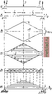 Главная --> Промиздат --> Коэффициент поперечной деформации 2h [X] Исправленное очертание балки показано на фиг. 312. § 122. Практические примеры балок равного сопротивления. Только что рассмотренный пример имеет применение на практике при проектировании рессор. Рессору, пренебрегая её достаточно слабой кривизной, можно рассматривать как балку на двух опорах (фиг. 313, а)у нагружённую силой Р посредине пролёта и Р реакциями -у по концам. Запроектируем этот стержень как балку ipaiBmro сопротивления с постоянной высотой и переменной шириной й; по симметрии достаточно ограничиться рассмотрением одной половины пролёта. Моменты сопротивления W{x) и будут выражаться также, как и в первом примере. Наибольший изгибающий момент - посредине пролёта - равен Изгибающий момент в любом сечении М{х)=. Решая задачу, как и в первом примере, получим: b{x) = bo. (20.5) Ширина балки, необходимая для обеспечения сопротивления поперечной силе определяется формулой 3 Р bmin = Т Т. е. ширина меняется по линейному закону в зависимости от х. При х = / ширина равна Ь, Вид балки в фасаде и плане показан на фиг. 311. Такое очертание балки получается, если учитывать её прочность только по отношению к нормальным напряжениям; ширина Ь{х) в сечении В обращается в нуль. Однако необходимо обеспечить прочность и по отношению к касательным напряжениям. Наименьшая ширина балки, требуемая этим условием, определится из уравнения 3 Qгc\г\ г 1 или, так как Q = p, Вид рессоры в фасаде и плане показан на той же фиг. 313, б и 5. Подобная конструкция рессоры была бы крайне неудобной на практике; поэтому ей придают несколько другую форму, не меняя характера её работы. Представим себе, что в плане лист рессоры разделён на узкие полоски, как показано на фиг. 313, г. Если мы расположим эти полоски не рядом друг с другом, а одну над ![]() ![]() ;г------ ![]() Фиг. 313. Фиг. 314. другой, то, если пренебречь трением между ними, работа балки не изменится, а рессора получит вид, изображённый в плане на фиг. 313, д и в фасаде - на фиг. 313, е. Конечно, на практике каждый лист рессоры, 1-й, 2-й и т. д., изготовляют цельным, а не состоящим из двух половинок. Балки переменного сечения применяются и в машиностроении; например, валы часто конструируются как балки равного сопротивления. Пример 87. Возьмём вал, опёртый по концам (фиг. 314, а) и нагружённый весом маховика в расстоянии а от левой и от правой опоры. Пролёт вала /. Найдём форму балки равного сопротивления для вала. Реакции вала равны Ра I -/ 32PQ Для левой части вала имеем условия: тогда РаЬ 32 РЬх, 32 или для правой части вала получаем: Наименьший диаметр у концов вала может быть определён по условию прочности на касательные напряжения: Siax = -о- -= [-l для левой части min 4 АРа - -= [х] для правой части. 3 min Отсюда 3ic/lx Pa 3ic/lx Этот диаметр, однако, приходится обычно значительно увеличивать из условий проверки цапф вала на нагревание. Теоретическая форма вала показана на фиг. 314, б. Практически диаметр вала меняют ступенчатым образом. Разницу между d и rfjjjjj разбивают на несколько частей; таким образом, отдельные участки вала будут иметь диаметры rf, rfi, rfj, ... Длину каждого участка проще всего определить графически, пользуясь эпюрой моментов. Вычисляем для этого моменты сопротивления, соответствующие диаметрам d, rfi, rfg, ..они будут max ~~>i ~ * Д- Умножая ЭТИ моменты сопротивления на допускаемое напряжение [а], получаем величину допускаемого изги