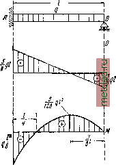 Главная --> Промиздат --> Коэффициент поперечной деформации § 137] СПОСОБ СРЛВНЕННЯ ДЕФОРМАЦИЙ 435 Составим все уравнения статики для нашей балки, приравнршая нулю сумму проекций всех сил на направление оси балки, на перпендикуляр к ней, и сумму моментов относительно точки Л. Получим систему: Ял = 0, A-\-B - ql = 0, Жл+ -Ж = 0. (23.1) Из первого уравнения сразу определяется опорная реакция И с для определения трёх других остаются лишь два уравнения. За лишнюю реакцию можно взять любую из этих трёх: попробуем взять реакцию опоры В. В таком случае мы должны считать, что рассматриваемая балка получилась из статически определимой балки АВу защемлённой концом А (фиг. 357), у которой потом поставили добавочную опору в точке В. Эта статически определимая балка, которая получается из статически неопределимой при удалении добавочного, лишнего опор- Фпг. 357. ного закрепления, называется основной системой. Выбрав какую-либо из реакций £ за лишнюю неизвестную, мы тем самым вы- А i. 111 i I М И ! I Ш ! i \ТГ. бираем основную систему. х- Попробуем теперь превратить основную - - систему (фиг. 357) в систему, полностью 338. совпадающую с заданной статически неопределимой балкой (фиг. 356). Для этого загрузим её сплошной нагрузкой див точке В приложим лишнюю реакцию В (фиг. 358). Однако этого мало: в балке, изображённой на фиг. 358, точка В может перемещаться по вертикали под действием нагрузок q и В; между тем, в нашей статически неопределимой балке (фиг. 356) точка В не имеет этой возможности, она должна совпадать с опорным шарниром. Поэтому, чтобы привести к окончательному совпадению фиг. 356 и 358, надо к последней добавить условие, что прогиб точки В основной системы под действием нагрузок q и В должен быть равен нулю: Д = 0. (23.2) Это и будет добавочное уравнение, определяющее реакцию В; оно является условием совместности деформаций в рассматриваемом случае: конец В балки не отрывается от опоры. Решение этого добавочного уравнения возможно несколькими способами § 137. Способ сравнения деформаций. Выполняя решение составленного в § 136 уравнения (23.2) /в = 0, названного уравнением совместности деформаций, можно рассуждать следующим образом. Прогиб точки В основной системы под действием нагрузок q я В складывается из двух прогибов: одного /вд, вызванного лишь нагрузкой q, и другого /вд, вызванного реакцией В, Таким образом, а) д /в=/вд+/вв = 0, (23.3) I щи и 111111 11Г1 i Остаётся вычислить эти прогибы. Для - I 1 этого загрузим основную систему одной нагрузкой q (фиг. 359, а). Тогда прогиб - 1- точки В будет равен: Фиг. 359. При нагружении основной системы реакцией В (фиг. 359, б) имеем: fBB- + j. Подставляя эти значения прогибов в уравнение (23.3), получаем: Отсюда SEJSEJ В = . (23.4) В этом способе мы сначала даём возможность основной системе деформироваться под действием внешней нагрузки q, а затем подбираем такую силу В, которая бы вернула точку В обратно. Таким образом, мы подбираем величину неизвестной дополнительной реакции В с тем расчётом, чтобы уравнять прогибы от нагрузки q и силы В. Этот способ и называют способом сравнения деформаций. Подставляя значение лишней реакции В в уравнения статики (23.1), получаем Д = 5, ![]() Фиг. 360. Выражение изгибающего момента получаем, рассматривая правую часть балки (фиг, 358) и подставляя значение В: 2 2 4 138] ПРИМЕНЕНИЕ ТЕОРЕМЫ КАСТИЛЬЯНО Поперечная сила Q выражается формулой Q = - B-{-qx = - q <J 1 Эпюры моментов и поперечных сил