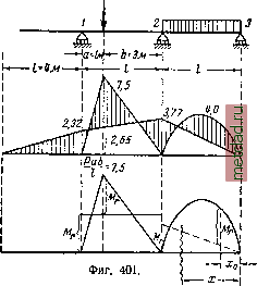 Главная --> Промиздат --> Коэффициент поперечной деформации § 151] ПРИМЕР Таким образом, при возможности разрушения промежуточного пролёта должны образоваться три пластических шарнира, моменты в которых будут одинаковы. Если бы на- р2п1 грузка была расположена -Л т на всех пролётах нашей ба-тки, то следовало бы рассмотреть возможность разрушения каждого из пролётов, построить соответствующие эпюры расчетных моментов (путём уравнивания их величин в опасных сечениях) и по- Т\ добрать W по наиболь-cJ \ шему из полученных М, В качестве примера загру- i зим трёхпролётную балку { i (фиг. 400) равномерной на- *jgj2 y qi2 грузкой q в среднем про- f г2 ff лёте и сосредоточенными силами Р = 2/ в середи- иг. 400. нах крайних пролётов. Определение расчётных моментов Mr для всех трёх пролётов показано на чертеже пунктиром; они равны ![]() M..=C; л. =; л-=- Подбор сечения балки следует вести по Моменту М;. = ; момент сопротивления равен 37j Подобным же образом q следует проводить расчёт /г-любой многопролётной не- разрезной балки, оценивая возможность разрушения каждого 413 пролётов. § 151. Пример. Пример 103. Подобрать двутавровое сечение по методу допускаемых напряжений и допускаемых нагрузок для трёхпролётной неразрезной балки (фиг. 401, а) постоянного сечения с равными пролётами / = 4 балка нагружена в среднем пролёте сосредоточенной силой Р = 10 т на расстоянии а = = 1 лс от левого конца среднего пролёта. Крайний правый пролёт загружён сплошной нагрузкой = 2 7/п(;г. лс; ![]() 472 РАСЧЁТ БАЛОК по ДОПУСКАЕМЫМ НАГРУЗКАМ [гЛ. iTXIV 1. Расчёт по допускаемым напряжениям. Составляем уравнения трёх моментов 2М,(/ + /) + Л1,/ = ->6(/ + ), -ёг( + ) + 4 Afi/ + 2Af2 (/ + /) = -6 Подставляя числовые значения, имеем: 16Af 1 + 4Af2 = - (4 + 3) 52,5, AM, + 1Ш, = ~ (4 + 1) = - 69,5; откуда Afi = - 2,32 тм\ Afa = - 3,77 тм. Ординаты эпюр моментов для основной системы под грузом и посредине крайнего правого пролёта = 7,5 тм\ Мд : Эпюра изгибающих моментов показана на фиг. 401, б. Наибольший изгибающий момент шах = 7,50 - 2,65 = 4,85 тм, М = 303 см\ Необходимо поставить двутавр N2 24а с \ = 317 см. 2. Расчёт по допускаемым нагрузкам. Предельное состояние среднего пролёта будет при Расчётный момент в сечении под силой находим из уравнения: отсюда Условие прочности приводит к ответу: MrnW[<i] РаЬ 10000.100 . 300 Ш [а] - 2 . 400 . 1,16 . 1600 - Необходимо поставить двутавр Х2 20а с U = 203 см. Расчётный момент для крайнего пролёта определяется из условия, что Afjnax пролёте равен моменту на опоре; их величина и будет Mf, Выражение для М{х) при предельном состоянии имеет вид § 152] ОБЩИЕ понятия 473 Приравнивая производную от этого выражения нулю, находим абсциссу сечения с моментом, равным Л!,, Уравнение для определения Mr имеет вид М 9Lx -З.х- X -М -тах - у - у - -о - Подставляя числовые данные, имеем: Mr = 3,39 тм < = 3,75 тм. Сечение должно быть подобрано по Mr для среднего пролёта. Описанный способ расчёта неразрезных балок требует ряда оговорок и ограничений. Во-первых, он относится к статическим нагрузкам. Во-вторых, физическая картина разрушения балки и при статической нагрузке гораздо сложнее той, весьма упрощённой, схемы образования пластических шарниров, о которой речь шла выше. Пластическая деформация не сосредоточивается в одном сечении, а распространяется и по длине балки. Затем исчерпание грузоподъёмности может произойти не только за счёт пластических деформаций, а и за счёт потери устойчивости как всей балки в целом, так и листов сжатого пояса или стенки 