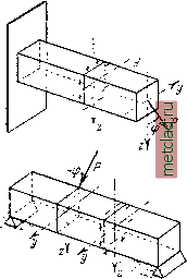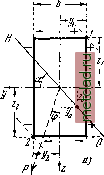 Главная --> Промиздат --> Коэффициент поперечной деформации В данном случае этой формулой можно пользоваться при вычислении напряжений в любой точке каждого сечения балки. Так как формула выведена для точки с положительными координатами у и Zy то, подставляя в неё значения координат с соответствующими знаками, будем всегда получать по формуле (26.2) правильный знак напряжения. Так, для точки D (фиг. 409) координата у будет положительна, г Z - отрицательна; в соответствии с этим первое слагаемое в формуле (26.2) представит собой положительное (растягивающее) напряжение, а второе - попрежнему сжимающее. Хотя формула (26.2) и получена из рассмотрения частного случая косого изгиба балки, защемлённой одним концом и нагружённой на другом сосредоточенной силой Р, однако, как нетрудно заметить, она является общей формулой для вычисления напряжений при косом изгибе. Для балок иначе нагружённых и закреплённых нужно лишь договориться о правиле знаков. Если положительное направление главных центральных осей инерции поперечного сечения балки всегда выбирать так, чтобы след плоскости действия сил в сечении проходил через первый квадрант, то знак перед правой частью формулы (26.2) необходимо назначать по тому действию, которое изгибающий момент М (или, что равноценно, его компоненты) оказывают на любую площадку первого квадранта (при растяжении ставить плюс, при сжатии - минус). Тогда для получения по формуле (26.2) правильного знака напряжения на любой другой площадке поперечного сечения достаточно учитывать знаки координат у ]Л Z, Для нахождения наибольшего нормального напряжения надо отыскать опасное сечение балки и в нём наиболее напряжённую точку. Из формулы (26.2) видно, что опасным сечением будет то, где изгибающий момент М достигнет наибольшей величины. Для нахождения опасной точки учтём, что при плоском изгибе деформация, соответствующая нормальным напряжениям, сводится к относительному повороту сечений вокруг нейтральных осей. При косом изгибе, являющемся комбинацией двух плоских изгибов, мы имеем - - M-z J - момент инерции относительно оси которая при изгибе моментом My будет нейтральной осью. Момент Мг вызывает в этой точке тоже сжимающее напряжение, равное - sin ср; - момент инерции сечения относительно ОСИ Z, Полное напряжение в точке С находим как алгебраическую сумму полученных напряжений: о = ф£ лУ: д1(1£2! 1£!11\, (26.2) одновременный относительный поворот сечений вокруг двух осей, пересекающихся в центре тяжести сечения. Из кинематики известно, что вращение фигуры вокруг двух пересекающихся осей может быть заменено вращением вокруг оси, проходящей через точку пересечения. Таким образом, и при косом изгибе мы в каждом сечении будем иметь линию, проходящую через центр тяжести, вокруг которой будет происходить поворот сечения при деформации балки. Эта ось и будет нейтральной; волокна, расположенные в её плоскости, не будут удлиняться или укорачиваться, и нормальные напряжения в точках нейтральной оси будут равны нулю. При относительном повороте сечений наибольшую деформацию (растяжение или сжатие) испытывают волокна, наиболее удалённые от нейтральной оси. Поэтому нахождение опасных точек при косом изгибе сводится к определению положения нейтральной оси и отысканию точек, наиболее далеко от неё отстоящих. Уравнение нейтральной оси получим Фиг. 411. 