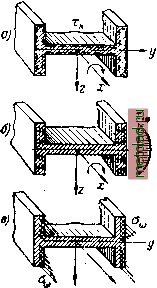 Главная --> Промиздат --> Коэффициент поперечной деформации Вырезав элемент стержня длиной dx (заштрихованный на фиг. 464, 6)у выясним, какие напряжения возникают по сечениям этого элемента. Будем при этом считать, что контуры поперечных сечений стержня не деформируются* Эта основная гипотеза теории, принятая взамен гипотезы плоских сечений, предполагает, что в деформированном состоянии, несмотря на депланацию сечения при кручении, контуры двутавра сохраняют свою форму, т. е. проекция сечения, претерпевшего депланацию, на плоскость сечения остаётся дсутавром (как это показано на фиг. 464, в). На практике неизменяемость контура сечения обычно обеспечивается постановкой диафрагм в нескольких сечениях по длине стержня, препятствующих могущим иметь место искажениям формы контура. Полки двутавра, как это видно нз фиг. 464, г, изгибаются в разные стороны моментами М, направленными в противоположные стороны; при переменном изгибающем моменте можно считать, что в сечениях полок возникают дополнительно к изгибающим моментам М поперечные силы Q, ![]() ![]() Фиг. 465. Фиг. 466. направленные в противоположные стороны (фиг. 464, г и 465). Под действием этих силовых факторов в сечениях элемента, выделенного из двутавра, возникают три группы напряжений, показанных на фиг. 466. а) Касательные напряжения (фиг. 466, а\ зависящие от той части внешнего момента, которую мы назовём моментом чистого кручения. Эти напряжения могут быть подсчитаны по формулам § 67 (глава XI), которыми мы пользовались при чистом кручении стержней некруглого сечения: § 173] ВНУГРЕННИЕ УСИЛИЯ в СЕЧЕНИЯХ СТЕРЖНЯ 535 Здесь - геометрическая характеристика сечения при кручении, условно названная моментом инерции при кручении; 8 - толщина стенки сечения в рассматриваемой точке; - момент чистого кручения, величина которого остаётся пока неизвестной. б) Дополнительные (вторичные) касательные напряжения т, возникающие в полках двутавра под действием поперечных сил Q (фиг. 466, б). Эти касательные напряжения для рассматриваемого случая можно подсчитать и по методу Журавского, если величина поперечных сил станет известной. Заметим, что силы Q приводятся к паре с моментом M = Qh (фиг. 465); этот момент, вызывающий появление вторичных касательных напряжений, мы назовём изгибнОКрутящим моментом, а соответствующие касательные напряжения - секториальными касательными напряжениями (тJ. Смысл этих терминов\ выяснится ниже. в) Нормальные напряжения в полках двутавра; поскольку внешние силы приводятся к паре, вращающей вокруг оси лг, эти напряжения образуют статически уравновешенную систему внутренних усилий (фиг. 466, в). Они пропорциональны относительным удлинениям волокон, вызванным неравномерной депланацией сечений, называются секториальными нормальными напряжениями и обозначаются а. Очевидно, что при депланации сечений одни волокна будут удлиняться, другие укорачиваться, а значит, будут и нейтральные волокна, не подвергающиеся ни растяжению, ни сжатию. Следовательно, в сечении будут точки, в которых нормальные напряжения обратятся в нуль, так называемые нулевые точки сечения. Так как при изгибе и кручении тонкостенных стержней сечения не остаются плоскими, то нулевые точки обычно не лежат на одной прямой, нейтральные волокна не группируются в нейтральный слой. Отыскание нулевых точек сечения, как мы увидим ниже, име