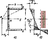 Главная --> Промиздат --> Коэффициент поперечной деформации ![]() ш= J rds, Фиг. 486. ведёт к изменению значения секториальной площади на постоянную величину. Это видно из фиг. 486; при перенесении начала отсчётов из точки Mi в точку Ж, секториальная координата какой-либо точки получит значение: о) = о) -(оЛ , (30.33) где О) - секториальная координата точки п при исходном начале отсчётов в точке М, а (о - удвоенная площадь сектора АМуМ т. е. секториальная координата новой начальной точки Ж, отсчитанная от прежнего начала отсчётов Mi. До сих пор во всех выводах мы исходили из предположения, что секториальные площади строятся из центра изгиба, положение которого считалось известным. Однако иногда построение эпюры секториальных площадей выполняют, пользуясь произвольным полюсом, что дабт новые значения секториальных координат. Условимся относительно выбора положения полюса и начала отсчетов при построении секториальных эпюр следующим образом. Главным секториальным полюсом будем считать центр изгиба сечения Л, пользуясь которым в дальнейшем мы и будем вести построение секториальных эпюр. Начало отсчетов секториальных площадей будем вести от определенной точки сечения, называемой главной нулевой секториальной точкой. Как уже указывалось (§ 173), в сечении тонкостенного стержня, подвергающегося стесненному кручению, имеются точки, где а = 0 (нулевые точки). Главной кнулевой секториальной точкой М назовем нулевую точку, которая находится в кратчайшем расстоянии от центра изгиба Л. Радиус АМ назовём главным начальным радиусом, а секто-риальную эпюру, построенную от него - эпюрой главных секториальных площадей. В дальнейшем для определения положения главного секториаль-ного полюса и главной нулевой точки, нам придётся предварительно строить секториальные эпюры при произвольном выборе этих точек (подобно тому, как для отыскания положения главных центральных осей инерции сечения балки приходится сначала вести отсчёты от произвольно выбранных осей). Чтобы затем перейти к главным секториальным точкам, удобно воспользоваться приводимыми ниже форму/хами перехода к новой системе секториальных координат. а) Изменение начала отсчёта дуги s равносильно изменению пределов интегрирования функции 179] ВЫЧИСЛЕНИЕ СЕКТОРИАЛЬНЫХ ПЛОЩАДЕЙ б) Формула перехода при перенесении полюса из точки в точку А может быть получена из следующих соображений (фиг. 487). Возьмём на средней линии сечения любую точку л (у, z) (начало координат у viz для простоты взято в точке Ле). Для точки А элементарная секториальная площадь имеет значение dm = ds r. Если мы теперь перенесём полюс в точку А(уау zaX то элементарная секториальная площадь для той же точки п - будет: Длина перпендикуляра Га может быть выражена через 1 Го так: 1 Гд =Го -Ло* -ftc = = Гв - Za sin а -у а cos а, где sina=- ![]() Фиг. 487. =; следовательно: Или, умножив на ds и имея в виду, что d(uA=ds га> получаем: diA - dia -f Za dy -уА dz. Проинтегрировав, находим: >A = >o + ZAy -VaZ + C. (30.34) Это и есть формула перехода к новому полюсу. Здесь щ - секториальная площадь, полученная из произвольного полюса А\ у At Za-координаты нового полюса А\ С - произвольная постоянная, зависящая от выбора начала отсчёта дуги . Полученные формулы (30.33) и (30.34) позволяют перейти от произвольных исходных точек - полюса и начала отсчётов - к главным секториа льным точкам: центру изгиба и к главной нулевой сектор