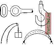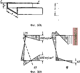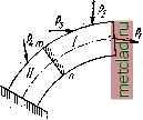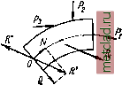 .1650кгГсм Площадь сечения F = (2 + Л) 5 = (2 3 + 6) 0,1 == 1,2 слс. Расстояние от средней линии стенки до центра тяжести сечения: S Т 3.0,1 Моменты инерции сечения относительно главных центральных осей: =.1,2 см*) Л = 2 Ьку1=\,\2Ъ см*. Расстояние от оси стенки до центра изгиба (30.42): 32 3 . 32 -g- = 1,125 см. Главный секториальный момент инерции сечения (30-43): ЬкЧ 2/1 + 3 3 . 62 . 0,1 (2 . 6 + 3 . 3) 3 12 б + Л ~ 12(6-3 + 6) -7,1слс. Эпюра секториальных п.ющадей приведена на фиг. 509, а. Ординаты эпюры © соответственно равны: 1 = ~ =~ 3,4 сж2; о), = А ( - а) = у (31,125)5,6 см\ пример 120. Рассмотрим ещё случай внецентренного растяжения тонкостенного стержня корытного профиля, изображённого на фиг. 508. Размеры сечения (по средним линиям контура): = 30 лслс; Л = 60 : 5 = I жис. Растягивающая сила приложена по краю полки и равна Р=150 кг. Наибольшие нормальные напряжения возникают у кромки растянутой полки и равны: , Р , MyZ , М,у h 150-6 Му = Р - ~=z -2- = 450 кгсм\ М2 = Р(Ь -Ус) = 150 (3 - 0,75) = 338 кгсм; В = Pip== 150 . 5,6 = 840 кгсм\ Подставляя координаты точки 2 сечения 2 - У - Ь - jvj получим: 150 , 450-3 338 - 2,25 840 - 5,6 -max- 12 7,2 1,125 7,1 = 125 + 188 + 677 + 660 = 1650 лгг/сж. Заметим, что дополнительные секториальные напряжения составляют от основных - 100 = 67о/о, а от полных: - 100 = 40о/о. Для сопоставления на фиг. 509, бив построены эпюры распределения нормальных напряжений: слева - по обычной формуле внецентренного растяжения (27.4), справа - с учётом изгибно-крутящего бимомента. ГЛАВА XXXI. КРИВЫЕ СТЕРЖНИ. § 184. Общие понятия. Кроме стержней с прямой осью в конструкциях часто встречаются элементы, у которых ось, т. е. линия, проходящая через центры тяжести поперечных сечений, является кривой. К ним относятся звенья цепей, проушины, крюки, арки, своды, станины подъёмных кранов и т. п. (фиг. 510). Кроме того, на практике строго прямых стержней не встречается; все стержни, рассчитываемые нами как прямые, имеют в той или иной степени небольшую кривизну. Поэтому изуче-v4 ние влияния кривизны оси стержня на распределение напряжений позволит нам, с одной стороны, проверять прочность явно кривых стержней, а с другой - оценить влияние небольших отступлений от прямолинейной формы на прочность прямых стержней. При проверке прочности подобных стержней введём следующие ограничения: ![]() \\\\\\\\\\\\\ j<w Фиг. 510. а) сечения стержня имеют ось симметрии; б) ось стержня представляет собой плоскую кривую, лежащую в плоскости симметрии; в) внешние силы лежат в той же плоскости. Тогда, вследствие симметрии, и деформация оси стержня будет происходить в той же плоскости; ось стержня останется плоской кривойу лежащей в плоскости внешних сил; мы будем иметь случай, аналогичный плоскому изгибу балки. Принимая при расчёте указанные выше ограничения, мы охватываем почти все встречающиеся на практике случаи работы кривых стержней. Нашей задачей будет отыскание наибольших напряжений, проверка прочности и вычисление деформаций кривых стержней. Решение этой задачи мы проведём совершенно аналогично тому, как мы поступили в подобном случае для прямой балки. ![]() Фиг. 511. § 185. Вычисление изгибающих моментов, нормальных и поперечных сил. Представим себе кривой стержень (фиг. 511), нагружённый внешними силами Pi, Рз, Р4 и т. д., расположенными, как указано в § 184, в плоскости симметрии поперечных сечений. В той же плоскости будут лежать и опорные реакции стержня. Для выяснения напряжений по сечениям, перпендикулярным к оси стержня, проведём одно из таких сечений тп, делящее