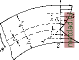 Главная --> Промиздат --> Коэффициент поперечной деформации В то время как для прямой балки мы имели линейный закон распределения напряжений, для кривого стержня напряжения о меняются по гиперболическому закону (фиг. 522). Из формулы (31.7) видно, что в наружных от нейтрального слоя волокнах напряжения растут медленнее, чем Z] во внутренних же, благодаря изменению знака z с положительного на отрицательный, они растут быстрее, чем Z. Таким образом, в кривом стержне нормальное напряжение во внутреннем крайнем волокне больше, а в наружном меньше, чем в тех же волокнах прямого стержня того же сечения. Это понятно: первоначальная длина внутреннего волокна в кривом стержне значительно меньше, чем наружного; в прямом же стержне эти длины равны. Поэтому и получается указанная выше разница в относительных деформациях, а стало быть, и в напряжениях для этих волокон. Перейдём к решению уравнений статики (31.4) и (31.6) с учётбм зависимости, полученной из рассмотрения деформаций (31.7). В уравнение (31.4) подставим (31.7): ![]() Фиг. 522. Вынося постоянные для рассматриваемого сечения величины за знак интеграла и сокраш.ая их, получаем: -dF = Q. 9 (31.8) Это уравнение позволяет найти положение нейтральной оси. Из равенства (31.8) ясно, что равен нулю не интеграл J 2: rfF, представляющий собой статический момент сечения относительно нейтральной оси, как это было для прямого стержня, а другой интеграл. Это показывает, что при изгибе кривого стержня нейтральная ось действительно не проходит через центр тяжести сечения. Заменяя в (31.8) z = p - г (фиг. 521), находим: откуда следует, что где М - изгибающий момент, а интегрирование охватывает всю площадь поперечного сечения. Интеграл, входящий в это уравнение, преобразуем следующим образом: последний из полученных двух интегралов равен на основании (31.8) нулю, а первый представляет собой статический мбмент 5 площади поперечного сечения относительно нейтральной оси. Эта величина может быть вычислена как произведение площади сечения F на расстояние её центра тяжести до нейтральной оси, т. е. на (фиг. 522): S = Fz. (31.11) Таким образом, уравнение (31.10) получает вид: Ж-£5 = 0; (31.12) отсюда и формула для нормальных напряжений напишется так: а = .. (31.14) В уравнении (31.12) мы находим подтверждение того, что здесь статический момент 5 площади сечения относительно нейтральной оси не равен нулю, т. е. нейтральная ось при изгибе кривого стержня не проходит через центр тяжести сечения, а несколько (на величину z) смещена. На фиг. 522 мы изобразили это смещение в сторону к центру кривизны стержня. Результаты определения величины г из уравнения (31.9) для различных сечений показывают, что нейтральная ось действительно смещается в указанном направлении. Это смещение связано с условием равенства между собой сумм сжимающих и растягивающих напряжений, действующих по сечению. Так как напряжения от изгибающего момента у наружного края сечения меньше, а у внутреннего - больше, чем в соответствующих волокнах прямого стержня того же сечения (фиг. 522), то для равенства указанных сумм нейтральная ось должна сместиться от центра тяжести сечения в сторону внутренних волокон. Ход вычислений величины г для каждого частного вида поперечного сечения будет различен. Подставив теперь зависимость (31.7) в уравнение (31.6), получим: Добавляя к полученным напряжениям найденные в предыдущем параграфе напряжен