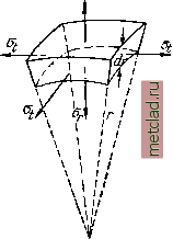 Главная --> Промиздат --> Коэффициент поперечной деформации § 198] НАПРЯЖЕНИЯ в СФЕРИЧЕСКИХ ТОЛСТОСТЕННЫХ СОСУДАХ 615 Минимальная температура до которой надо нагреть наружный цилиндр при надевании его на внутренний, определяется уравнением отсюда (при наших числовых данных: а = 125 10~; Е= 2 10* кг/см*; Arf = 0,0137 см). § 198. Напряжения в сферических толстостенных сосудах. На фиг. 547 изображён элемент, вырезанный из толщи стенки толстостенного сферического сосуда; внутренний радиус этого элемента равен г, а наружный г+П напряжения, действующие на этот элемент, изображены на чертеже. Составляя уравнения равновесия и совместности, получаем для и значения: А . (32.12) Постоянные А и В могут быть определены из условий на внутренней и внешней поверхностях сосуда при г = Гг и г = Г1 соответственно, где п и Гг -наружный и внутренний радиусы. Так, при действии внешнего pi и внутреннего р давлений А п В определяются Фиг. 547. из условий: = Л + -у = - ps на внутренней поверхности, В ![]() = Л + = - Pi внешней поверхности. Отсюда Тогда Pin-Pin (32.13) § 199. Расчёт тонкостенных сосудов. Если толщина стенок цилиндра t = ri - ri мала по сравнению с радиусами Г1 и Гг, то из формулы (32.10) мы получаем: Р2Г т. е. величину, определённую нами раньше (§ 34). Для тонкостенных резервуаров, имеющих форму поверхностей вращения и находящихся под внутренним давлением р, распределённым симметрично относительно оси вращения, можно вывести общую формулу для вычисления напряжений. Выделим (фиг. 548) из рассматриваемого резервуара элемент двумя смежными меридиональными сечениями и двумя сечениями, нормальными ![]() (JmdSft ![]() Фиг. 548. к меридиану. Размеры элемента по меридиану и по перпендикулярному к нему направлению обозначим соответственно dZj и йц, радиусы кривизны меридиана и перпендикулярного к нему сечения обозначим и Р толщину стенки назовём t. По симметрии по граням выделенного элемента будут действовать только нормальные напряжения в меридиальном направлении и в направлении, перпендикулярном к меридиану. Соответствующие усилия, приложенные к граням элемента, будут mt и tm- Так как тонкая оболочка сопротивляется только растяжению, подобно гибкой нити, то эти усилия будут направлены по касательной к меридиану и к сечению, нормальному к меридиану. Усилия adSmt = ac = bc (фиг. 549) дадут в нормальном к поверхности эле- ![]() Фиг. 549. мента направлении равнодействующую аЬ, равную abTcdbiOidSmt Подобным же образом усилия fst дадут в том же направлении равнодей- ствующую <mdSidSm-* Сумма этих усилий уравновешивает нормальное дав-ление, приложенное к элементу Р dSmdSt = mdStdSm + dSmdSt -f . 9m Pt Отсюда (32.14) Это основное уравнение, связывающее напряжения и для тонкостенных сосудов вращения, дано Лапласом. Так как мы задались распределением (равномерным) напряжений по толщине стенки, то задача статически определима; второе уравнение равновесия получится, если мы рассмотрим равновесие нижней, отрезанной каким-либо параллельным кругом, части резервуара. Рассмотрим случай гидростатической нагрузки (фиг. 550). Меридиональную кривую отнесём к осям х \l у z началом координат в вершине кривой. Сечение проведём на уровне у от точки О, Радиус соответствующего параллельного круга будет x. Каждая пара усилий mdtt, действующих на диаметрально противоположные элементы dst проведённого сечения, даёт вертикальную равнодействующую Ьс равную be - 2ab cos 0 = 2а dstt cos 0; сумма этих усилий, дейс