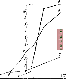 небольшого интервала температур. Таким образом, материал, хорошо сопротивляющийся удару при комнатной или близкой к ней температуре, может дать хрупкий излом уже при сравнительно небольшом понижении температуры. Поэтому результаты обычного испытания на удар при комнатной температуре недостаточно характеризуют сопротивляемость материала динамическим воздействиям; следовало бы получить полную кривую ударной вязкости в зависимости от температуры (фиг. 611, <2, , в). Чем левее располагается так называемый критический интервал падения ударной вязкости, тем материал менее чувствителен к воздействиям температуры при ударных нагрузках, тем более он надёжен в работе. Изменением формы образца можно в известной мере заменить испытание материала при разных температурах. Опыты показали, что переход к более широким образцам сдвигает критический интервал температур вправо, т. е. в сторону более высоких температур. Поэтому если обычная проба на удар при комнатной температуре даёт удовлетворительный результат, то для проверки того, не находимся ли мы вблизи критического интервала, можно произвести испытание на удар уширенных образцов; если это испытание даёт хрупкий излом, то критический интервал расположен близко к температуре опыта. Наконец, следует отметить, что на хрупкость материала могут очень сильно влиять так называемые остаточные напряжения, которые могут получиться в материале при закалке, при холодной прокатке или при недостаточной температуре горячей прокатки, когда материал получает наклёп. Опытами на растяжение такие напряжения, как правило, не могут быть выявлены. Остаточные напряжения обычно связаны с возникновением объёмного напряжённого состояния в материале; в связи с этим возможно хрупкое разрушение. Такие случаи встречались при изготовлении мощных двутавровых балок со сравнительно тонкими полками. В нашей практике был ![]() го 0 50 до W0 Фиг. 611. |