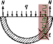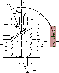 Главная --> Промиздат --> Коэффициент поперечной деформации ![]() § 35] ПРИМЕРЫ плоского и ОБЪЁМНОГО НАПРЯЖЁННОГО состояний 123 Вычислим эти напряжения. Обозначим через D диаметр цилиндрической части резервуара, / - её длину, t - толщину её стенок будем считать, что t мало по сравнению с D [t<D, Силы, действующие на днища и растягивающие цилиндрическую часть резервуара вдоль образующей, равны Площадь, воспринимающая эти силы, представляет собой кольцо толщиной t и диаметром D (поперечное сечение цилиндрической части). Величина этой площади (как полоски шириной t и длиной TZD) F = HD. Отсюда напряжение равно f P 4 дР ~ F~ tnD ~ 4t Напряжение а мы найдём, разрезав резервуар Фиг. 74. диаметральной плоскостью и отбросив верхнюю часть (фиг. 74). На диаметральную поверхность жидкости или газа в оставленной части действует давление q. Оно уравновешивается силами iV, растягивающими материал резервуара в направлении, перпендикулярном к образующим. Условие равновесия нижней части будет qDl=2IV, отсюда /V- 2 , и напряжения о равны n N дР1 дР ~tl~ 2tl~ 2i Напряжения по площадкам, параллельным образующим цилиндрической поверхности резервуара, в Ьеа раза больше, чем в направлении перпендикулярном. Элемент ABCDy вырезанный из стенки резервуара, испытывает растяжение по двум взаимно перпендикулярным направлениям. Напряжения о и о являются главными, так как по соответствующим им сечениям отсутствуют, вследствие симметрии нагрузки и деформации элемента, касательные напряжения. Третье главное напряжение, перпендикулярное к о и а , равно нулю. (Давлением газа по плоскости ABCD и атмосферным давлением на поверхность стенки котла, соответствующим этому главному напряжению, пренебрегаем по его малости, сравнительно с </ о.) Таким образом, мы здесь имеем дело с плоским напряжённым состоянием. Применяя правило нумерации главных напряжений, имеем o, = o = f; a, = c = f; аз = 0. (7.4) Примером объёмного напряжённого состояния может служить работа материала при передаче давления в шариковом подшипнике от шарика на обойму или при передаче давления от колёс подвижного состава на рельсы. Так как соприкасание поверхностей головки рельса и бандажа представляет собой соприкасание двух цилиндров разных радиусов с образуюш.имй, расположенными накрест, то эти две поверхности должны касаться друг друга в точке. Нормальные напряжения, возникающие в точке соприкасания при передаче давления от одного тела на другое, называются контактными напряжениями. ![]() Фиг. 75. ![]() При передаче нагрузки материал рельса и бандажа у этой точки деформируется, и передача давления происходит по площадке соприкасания, имеющей эллиптическую форму. Величина этой площадки зависит от величины передаваемого давления и соотношения радиусов соприкасающихся поверхностей. Если мы в центре площадки давления вырежем из материала рельса маленький кубик (например, с ребром 1 мм), грани которого параллельны и перпендикулярны к оси рельса (фиг. 75), то на грани этого кубика будут действовать лишь нормальные сжимающие напряжения ). Таким образом (фиг. 76), в данном случае мы имеем дело с тремя взаимно перпендикулярными площадками, по которым действуют главные напряжения о, о и Появление боковых напряжений о и о объясняется тем, что под действием напряжений о, перпендикулярных к площадке давления, материал выделенного нами кубика стремится раздаться в ст