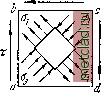 Фиг. 114. ![]() касательные, но и нормальные напряжения (§ 47), и деформация будет сложной. Это заставляет нас исходить при установлении величины допускаемого напряжения [т] в обш.ем случае не из рассмотрения достаточно сложных действительных условий работы заклёпочных или иных видов соединений, а из некоторых общих теоретических соображений. Теоретическое значение [т] при установлении норм, конечно, корректируется данными опытов. Пусть мы имеем малый элемент материала, по граням которого действуют только ка-сательные напряжения (фиг. 114). Такой вид плоского напряжённого состояния называется чистым сдвигом. Пусть, кроме того, допускаемое нормальное напряжение [а] для материала известно, и требуется найти величину допускаемого касательного напряжения [т], написав условие прочности для рассматриваемого элемента. Как известно (см. главы VII и VIII), для любой точки напряжённого материала можно найти главные площадки и главные напряжения (§ 34); поэтому задачу расчёта на сдвиг можно свести к задаче проверки прочности при сложном напряжённом состоянии (§ 42). Для решения поставленной задачи найдём величины главных напряжений и проследим применение рассмотренных в § 43 теорий прочности. Заметим, что по закону парности касательных напряжений [§ 36, формула (7.8)] касательные напряжения, действующие по вертикальным и горизонтальным граням элемента, одинаковы. По фасадной грани abed нет никаких напряжений. Следовательно, эго - одна из главных площадок, на которой главное напряжение равно нулю. Для определения направления и величины двух других главных напряжений воспользуемся построением круга напряжений, что можно сделать, если известны напряжения, действующие по двум взаимно перпендикулярным площадкам (фиг. 115, б). От точки О, поскольку нормальные напряжения при гранях элемента (фиг. 114) равны нулю, отложены: вверх - отрезок OD, равный i = z, и вниз - OZ), равный 1ъс = - Так как точки и D лежат на круге, то радиус его равен 00 = .,