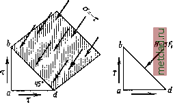 Главная --> Промиздат --> Коэффициент поперечной деформации ![]() Отрезки OA и ОВ определяют величины главных напряжений Oi И Оз И равны радиусам круга, а направление BD, составляющее угол 45 с нормалью к площадке be, совпадает с направлением о. Следовательно, применяя обозначения § 34, имеем: Oi = t; Оз = -т. Напряжение по фасадной грани abed а = 0. Таким образом, если рассечь наш элемент (при условии, что грань abed - квадрат) диагональными плоскостями, то по сечению ас будут действовать растягивающие напряжения ai = T, а по сече-гию bd - сжимающие: с = - т (фиг. 115, а). Это можно было бы доказать и иначе, не пол1Ьзуя.сь построением круга напряжений, а рассматривая условия равновесия- отсечённой itactm (фиг. 116). Такое до*сазательство рекомендуется читателям выполнить самостоятельно. Следовательно, чистый сдаиг эквивален-т ен комбинации двух радйых по числовой величине нормальных напряжений - одного растятшшощего и другого сжимающего. Каждое из этих напряжений равно по числовой величине касательному напряжению, вызывающему чистый сдвиг; площадки, по которым действуют главные (норшльные) напряжения, составляют угол 45 с площадками действия только касательных напряжений. Если мы выделим элемент из параллелепипеда abed плоскостями, перпендикулярными к диагоналям ас и bd (фиг. 115, а), то этот элемент будет подвергаться растяжению в направлении bd напряжениями oi и сжатию в направлении ас напряжениями 03. В § 33 мы выяснили, с какими видами деформаций связаны нормальные и касательные напряжения. Первым соответствовало удлинение или укорочение, вторым - сдвиг. Теперь мы видим, что такого резкого разграничения провести нельзя. Деформация сдвига непременно сопровождается и деформациями растяжения и сжатия. Как видно по фиг. 115, а, из элемента, подвергающегося по его граням действию только касательных сил, моно выделить новый элемент, по граням которого действуют только нормальные напряжения. Таким образом, весь элемент, изображённый на фиг. 114, испытывает деформацию чистого сдвига, а материал этого элемента в то же время претерпевает в некоторых направлениях растяжение или сжатие. Фиг. 116. Yol CJ -[- 0 - О1О2 - ООз - О3О1 < [о], или отсюда [т] = 0,57 [о] 0,6 [о]. (10.18) Мы видим, что результаты, полученные по различным теориям прочности, существенно отличаются друг ог друга. Поэтому вопрос Зная главные напряжения oj, 02 и 03 и допускаемое напряжение для материала нашего элемента при простом растяжении [о], мы можем составить условие прочности для этого элемента, применяя ту или иную из изложенных выше теорий. По теории наибольших нормальных напряжений проводить проверку прочности не следует, так как она устарела. Поэтому мы начнём решение вопроса о проверке прочности при чистом сдвиге с применения теории наибольших относительных удлинений, которая применялась в машиностроении более полувека, хотя, строго говоря, она неприменима к пластичным материалам. В этом случае (§ 43) условие прочности принимает вид; [oi -(а-(02-}-0з)]<[а]. Подставляя значения ai = T, 0 = 0 и 03 = - т, получаем: [х 1.( т)]<[а], или т(1+1.)[а]. Отсюда величина касательных напряжений при чистом сдвиге должна удовлетворять условию: т<:М = [х]. (10.16) Дробь, стоящая в правой части неравенства, представляет собой допускаемую величину касательного напряжения [х] при чистом сдвиге. Для стали j-0,3, поэтому М = (0,7--0,8) [а]. Если же мы возьмём за основу третью теорию прочности (на