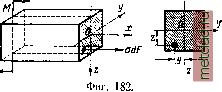 Главная --> Промиздат --> Коэффициент поперечной деформации § 78. Вычисление нормальных напряжений при изгибе. Закон Гука и потенциальная энергия при изгибе. А. Возьмём балку, подвергающуюся чистому изгибу парами М (фиг. 182). Пользуясь методом сечения, разрежем балку сечением У-У на 2 части и рассмотрим условия равновесия одной из отсечённых частей, например левой, показанной на фиг. 182 внизу. Для простоты чертежа балка взята прямоугольного сечения. Так как практически искривления балки ничтожны по сравнению с её размерами, то отсечённая часть изображена недеформированной. Линия пересечения плоскости симметрии балки с плоскостью сечения принята за ось Z (положительное направление взято вниз); нейтральная ось сечения принята за ось у, причём положение её по высоте балки пока неизвестно. Ось X взята вдоль нейтрального слоя перпендикулярно к осям у и Z. В каждой точке поперечного сечения действуют нормальные напряжения с. Выделив вокруг любой точки с координатами у и z элементарную площадку dF, обозначим действующую на неё силу dN=a dF. Отсечённая часть балки находится в равновесии под действием внешних сил, образующих пару УИ, и нормальных усилий dN, заменяющих отброшенную часть балки. Для равновесия эта система сил должна удовлетворять шести уравнениям статики. Напишем сначала уравнения проекций на 3 координатные оси х, у, z. Так как проекция пары М на любую ось равна нулю, то эти уравнения дадут равенство нулю суммы проекций нормальных усилий dA на оси. Заменяя суммирование этих усилий по всей площади сечения интегрированием, получим: ![]() Л=0; J GdF=0. (13.1) 2К=0 и VZ = 0 обращаются в тождества вида 0 = 0, так как усилия dN=adF проектируются на эти оси в точку. Составим теперь уравнения моментов относительно осей х, у и z. Заметим при этом, что пара М лежит в плоскости xOz и потому моментов относительно осей Ох и Oz не даёт. Mj = 0 обращается в тождество, так как усилия dNodP параллельны оси х: 2Мз, = 0; M-dNZ = 0 или M-odFZ=0 откуда o*zdF=M\ (13.2) VA1, = 0; dNy = 0 или adF*y = 0. (13.3) Таким образом, из шести уравнений равновесия можно использовать только три: Х = 0 или J cdF = 2Му = 0 или azdF= 2M, = 0 или jaydF=0. = 0, (13.Г) (13.20 (13.3) Однако полученных трёх уравнений статики недостаточно для определения величины нормальных напряжений, так как с изменяется в зависимости от расстояния z площадки dF до нейтральной оси по неизвестному пока закону. Это расстояние (Z) тоже неизвестно, так как неизвестно положение нейтральной оси у, Б. Обратимся к рассмотрению деформаций балки, для чего двумя бесконечно близкими сечениями У-/ и 2-2 выделим из неё элемент длиной dx. Вид этого элемента до и после деформации показан на фиг. 183. Для ясности чертежа деформация элемента показана с сильным преувеличением. Оба поперечных сечения, оставаясь плоски/ кими, повернутся вокруг нейтральных осей (на фасаде точки 0 и 0) и образуют угол da. Нейтральный слой показан пунктиром. Линия OiOj, принадлежащая нейтральному слою, после деформации сохранит свою первоначальную длину dx. Все волокна, лежащие выше нейтраль-HOiO слоя, укорачиваются, а ниже - удлиняются. ![]() Фиг. 183. ![]()