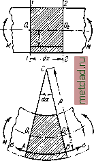 соте сечения по линейному ) \~ закону. / \ V На нейтральной оси при [ (Нейтральный слой \ z - и а = 0; при переходе в сжатую зону (выше нейтральной оси) о вместе с Z меняет знак на минус (сжатие) и вновь растёт по Фиг. 184. абсолютному значению по мере удаления от нейтральной оси. Следовательно, наибольшего значения напряжения достигнут у верхнего и нижнего краев сечения при -2 =-тах Характер распределения напряжений показан на фиг. 184. Уравнение (13.4) даёт только характер распределения нормальных напряжений по сечению, но им нельзя воспользоваться для вычисления величины их, так как ни р, ни z неизвестны, поскольку неизвестно расположение нейтрального слоя по высоте сечения. В. Для определения а в зависимости от изгибающего момента обратимся к совместному решению полученного из рассмотрения деформаций уравнения (13.4) и уравнений статики (13.1), (13.2) и (13.3). Найдём удлинение какого-либо волокна АВ, расположенного в расстоянии z от нейтрального слоя и растянутого напряжениями а. Первоначальная длина этого волокна равна dx= 00 = dd. После деформации его длина по дуге АВ стала AB - {-\-z)d(i. Абсолютное удлинение рассматриваемого волокна Ы = -\-z)dx - - pd7. = zd7.. Относительное удлинение равно Z da z ~Jdi~ р т. е. удлинения волокон пропорциональны их расстояниям до нейтрального слоя. Здесь р - радиус кривизны нейтрального слоя, величину которого для выделенного (бесконечно малого по длине) элемента можно считать постоянной. Допустив, что при изгибе волокна друг на друга не давят и что каждое волокно испытывает простое (линейное) растяжение или сжатие, - для вычисления напряжений можем воспользоваться законом Гука при растяжении: а = Ег ИЛИ а = -, (13.4) Уравнение (13.4) показывает, что величина нормальных напряжений при изгибе меняется прямо пропорционально расстоянию z рассматриваемой точки сечения от нейтрального слоя. Значит, напряжения распределены по вы- |