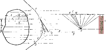 Главная --> Промиздат --> Коэффициент поперечной деформации § 88. Приближённый метод вычисления моментов инерции площади. В некоторых случаях очертание поперечного сечения оказывается настолько сложным, что его трудно разбить на простые элементы, особенно если это очертание криволинейно. Тогда можно при\. ть следующий приближённый метод вычи -я момента инерции этой фигуры относые..но какой-нибудь оси у (фиг. 203). Ра?теляем фигуру на полоски линиями, параллельными оси у\ ширину полосок t выбираем малой по сравнению с размерами фигуры. Тогда каждую из этих полосок можно принять за прямоугольник высотой t и переменной шириной Момент инерции каждой такой полоски относительно оси у будет равен: ![]() Фиг. 203. Так как мы выбрали высоту полосок t малой, то слагаемым можно пренебречь по сравнению с а tb. Тогда полный момент инерции фигуры будет равен: JyI.a4b = Y,adF. (14.22) Чтобы оценить точность этого метода, вычислим момент инерции относительно центральной оси прямоугольника, изображённого на фиг. 204; прямоугольник взят потому, что ДЛЯ него легко подсчитать точное значение Jy, Так как мы вы- 20см числяем момент инерции относительно оси симметрии, то достаточно вычислить момент инерции ДЛЯ верхней половины сечения и результат удвоить. Разделим верхнюю половину площади сечения на 5 ПОЛОСОК высотой по t = 2 см\ ширина всех полосок одинакова. Тогда A = 2!Sfl2:=2. 10 . 2(12+ 32+ 5 + 72+ 92) = = 6600 см\ Точная величина этого момента инерции равна: , № 10-20 У =--==-- = 6667 см\ Разница Фиг. 204. 6667 - 6600 67 6667 ~6667/ Мы видим, что даже при таком грубом делении площади на полоски результат получается достаточно точным. В пределе мы и приходим к точному выражению для момента инерции. При неправильном или криволинейном очертании фигуры кроме числового подсчёта по формуле (14.22) можно применить графический метод - построение верёвочного многоугольника. Начертим (фиг. 205) какую-либо фигуру в линейном масштабе л/1, проведём ось у и разделим рассматриваемую площадь на элементарные полоски bt. Приложим в центре тяжести каждой /г-й полоски условную (фиктивную) силу равную по числовой величине площади полоски; направление сил возьмём параллельно оси у. Построим силовой многоугольник в масштабе 1 с произвольным полюсным расстоянием Я, проведём лучи и построим верёвочный многоугольник. Возьмём в силовом многоугольнике какую-нибудь силу Fn\ продолжим стороны верёвочного многоугольника, пересекающиеся на линии этой силы в точке о, до пересечения их с осью у в точках k и т. Расстояние силы до ![]() Фиг. 205. оси у обозначим а. Заштрихованному на верёвочном многоугольнике треугольнику okm соответствует подобный ему треугольник ОКМ в силовом многоугольнике. Из подобия этих треугольников имеем: km Fn Произведение средних и крайних даёт нам aFn = km Умножим обе части этого равенства на л: ,z = /i -km- Н. Произведение an Ш= 2 . у а . равно удвоенной площади заштрихованного треугольника okm. Таким образом, момент инерции /г-й площадки (F = bt) относительно оси у численно равен площади заштрихованного треугольника okm, умноженной на удвоенное полюсное расстояние Н, * Надо помнить, что Н входит в силовой многоугольник и, стало быть, выражается, как и силы в единицах площади. Если проделать эти вычисления для всех сил F и просуммировать полученные результаты, то момент инерции фигуры У, равный ТЕа, будет графически изображаться произведением полюсного расс
