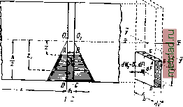 Главная --> Промиздат --> Коэффициент поперечной деформации На первый взгляд кажется странным появление касательных напряжений по этим (параллельным оси балки) сечениям. Однако сейчас же можно привести пример, поясняющий это явление. Представим себе балку состоящей из двух одинаковых брусков прямоугольного сечения, положенных друг на друга (фиг. 215, а); будем пренебрегать трением между ними. Предположим, что эта балка изгибается хотя бы силой Ру приложенной посредине пролёта. Вид балки после искривления в сильно преувеличенном масштабе показан на фиг. 215, б. Нижние волокна верхней балки AiBi растянулись, а верхние волокна нижней балки АВ сократились по сравнению со своей первоначальной длиной АВ. Если же балка является цельным бруском, то она изогнётся так, как показано на фиг. 215, tf. Волокна АВ окажутся в нейтральном слое и не изменят своей длины. ![]() ![]() ![]() Фиг. 215. Фиг. 216. Следовательно, при изгибе цельной балки по нейтральной плоскости от верхней половины балки на нижнюю, и обратно, будут передаваться касательные напряжения = х, удерживающие верхнюю и нижнюю половины балки от сдвига по нейтральному слою (фиг. 215, г). Изобразим на фиг. 216 нижнюю часть фасада балки прямоугольного сечения, испытывающей плоский изгиб. Проведём два очень близких сечения 7-/ и 2-2 на расстоянии dx друг от друга. Проведём ещё горизонтальное сечение на расстоянии z от нейтрального слоя. JO с Фиг. 217. Таким образом из балки выделится элемент ABCD размерами dXy у - Z и Ь. Вид этого элемента в аксонометрической проекции показан на фиг. 217. Пусть изгибающий момент в сечении 1-I равен Ж, а в смежном сечении 2-2 равен M-\dM. Тогда по боковым граням элемента йТ-будут действовать нормальные напряжения о - слева меньшие, справа ббльшие. По гори- Mj-зонтальному сечению будут действовать каса--тельные напряжения Касательные напряжения х по сечениям /-/ и 2-2 в условие равновесия выделенного элемента не войдут, так как мы используем равенство нулю суммы проекций всех сил на ось балки; поэтому мы их на чертеже и не изображаем. Для составления уравнений равновесия вычислим все силы, действующие на наш элемент, параллельные оси балки. Элементарное касательное усилие dT по площадке bdx будет равно dT = bdx. Нормальные напряжения, действующие по боковой бесконечно малой площадке dF на уровне от нейтральной оси, будут равны: Усилие dNi, приходящееся на эту площадку, будет равно; dN, = dF. На всю боковую грань AD будет действовать сила Ni (фиг. 217): ZidF. Интеграл I Zi dF представляет собой статтескпй момент относительно нейтральной оси у части площади сечения GFAD, /расположенной от уровня z до края балки (фиг. 218). Обозначим его S{z). Знак z показывает, что S(z) меняется в зависимости от того, на каком расстояния z от нейтральной оси мы вычисляем напряжение т. Таким образом. д. MS(z) (15.1) Аналогично на грань ВС нашего элемента действует сила {M + dM)S{z) ---. Разность нормальных усилий уравновешивается при проектировании на ось Ох (фиг. 217) касательным усилием dT, Отсюда jdM S(z) Но - = Qy поэтому dx Jyb QS (z) (15.3) a значит, этой же формулой выражается и касательное напряжение на уровне z по сечению, перпендикулярному к оси балки. Выведем формулу S{z) для случая балки прямоугольного сечения (фиг. 218) высотой h и шириной Ь, Статический момент площади QFAD относительно оси OiOj будет равен величине этой площади, умноженной на расстояние Zf от её центра тяжести до оси OiOi. Пло