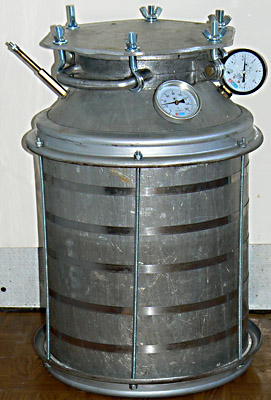 АвтоклавАвтоклав хорош тем, что загрузка сырья для приготовления консервов осуществляется при комнатной температуре, а стерилизация происходит при температуре 120 градусов без доступа воздуха. При такой тепловой обработке гибнут все вредоносные организмы, Какой бы ни была костлявой рыба, после обработки в автоклаве кости становятся мягкими и их наличие никак не проявляется. С его помощью можно делать рыбные консервы в томатным соусе, в масле (с любыми пряностями и добавками, исходя из вкусов рыбака). Поле деятельности и экспериментов безгранично. Тем более что затраты на консервирование незначительны. Но это уже кулинарный вопрос.нержавеющей стали. Фланцы можно изготовить из обыкновенной стали. Автоклав вещь серьёзная, поэтому прочность стоит на первом месте. Изготавливая автоклав, необходимо чётко представлять себе физические процессы, возникающие при избыточном давлении, высокой температуре, с силой действующих на стенки автоклава. Эксплуатировать его нужно грамотно и осторожно. То есть под постоянным надзором, Вначале автоклав предназначался для приготовления рыбных консервов в домашних условиях в квартире на пятом этаже. Таких, которые не отличались бы от заводских и хранились длительное время при комнатной температуре. В дальнейшем он нашёл применение для приготовления мясных и иных консервов, требующих обработки теплом и стерилизации. Его корпус, цилиндрическая часть, изготовлен из нержавеющей листовой стали толщиной 3,5 мм, Днище и крышка также нержавеющие. Толщина крышки 10 мм (фото 2, 3 11 — вид сверху и снизу). Толщина днища 5 мм. Для обеспечения надлежащей прочности к днищу дополнительно приваривается фланец. Цилиндр, дно и крышка должны изготавливаться из нержавеющей стали. Фланцы можно изготовить из обыкновенной стали. Автоклав вещь серьёзная, поэтому прочность стоит на первом месте. Изготавливая автоклав, необходимо чётко представлять себе физические процессы, возникающие при избыточном давлении, высокой температуре, с силой действующих на стенки автоклава. Эксплуатировать его нужно грамотно и осторожно. То есть под постоянным надзором. Весь процесс изготовления автоклава зависит от наличия необходимого инструмента, оборудования и предполагаемого объёма пойманной рыбки. В описываемый автоклав при высоте цилиндра 340 мм загружается одновременно три литровых банки и четыре пол-литровых. Однако, поэксплуатировав его более 10 лет, я пришёл к выводу: делать его нужно из расчёта загрузки восьми пол-литровых банок (в два слоя). Этого будет достаточно для переработки пойманной рыбы. При желании можно изготовить автоклав и более вместительный, однако эксплуатировать его в квартире будет трудновато. Теперь рассмотрим более подробно элементы автоклава. Отправной точкой при изготовлении автоклава является количество загружаемых в него банок и их размер. На моих рисунках и фотографиях нет конкретных размеров. Все размеры напрямую зависят от заданной вместимости и имеющегося материала. Изготовить детали по заданным кем-то размерам проблематично. Практически размер изготавливаемых деталей жёстко привязывается к цилиндрической части автоклава. Единственным размером, принятым за отправную точку, является внутренний диаметр цилиндра. Чтобы разместить в автоклаве четыре пол-литровых банки, его внутренний ди